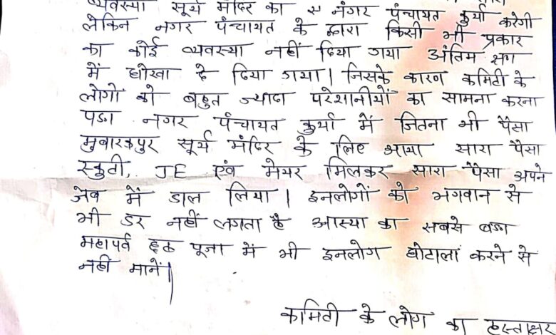 जिसके कारण कमिटी के लोगों को बहुत ज्यादा परेशानीयों का सामना करना पड़ा नगर पंचायत कुर्या में जितना भी पैसा मुबारकपुर सूर्य मंदिर के लिए आया सारा पैसा स्कुटीब,जे ई एवं मेयर मिलकर सारा पैसा अपने जेब में डाल लिया।