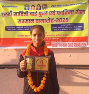 जमुई जिला अंतर्गत झाझा प्रखंड के सिमुलतला की 11 वर्षिय बेटी करांटे क्वीन जूही कुमारी को राजस्थान प्रदेश के जयपुर में भारतीय दलित साहित्य अकादमी ओर एकल महिला मंच संगठन द्वारा आयोजित सावित्री बाई फुले सम्मान एवं फातिमा शेख सम्मान समारोह में सम्मानित हुई ।