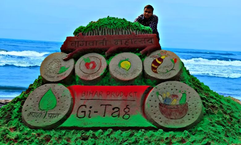 राजधानी पटना के गांधी मैदान तीन दिवसीय बागवानी महोत्सव में रेत पर सैंड आर्टिस्ट मधुरेंद्र कुमार ने बिहार के धरोहर मिथिला मखाना, मगही पान, भागलपुरी जर्दालू और बिहार का गौरव शाही लीची व मधुमक्खी पालन सहित अन्य उत्पादों को जीआई टैग मिलने पर अपनी कलाकृति बनाकर बिहार के किसानों के लिए खुशी का संदेश दिया है।
