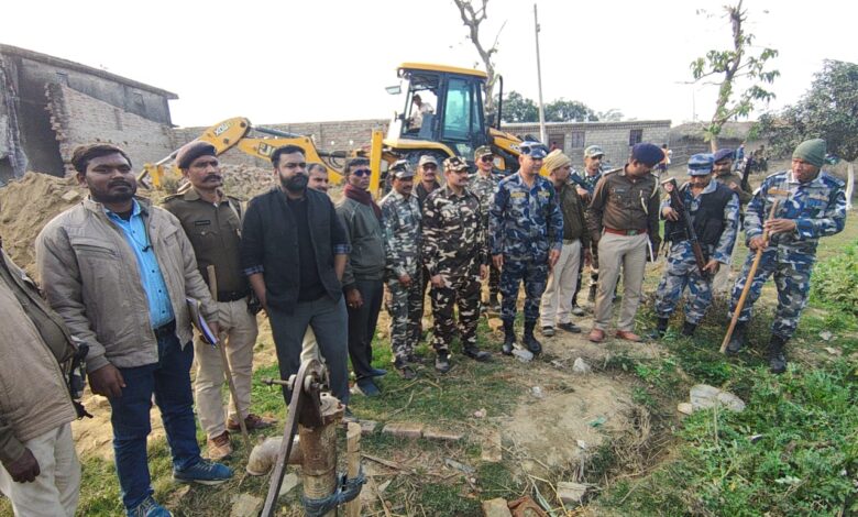 गदियानी भंगहा में नो मैंस लैंड पर बने घर को बुलडोजर से हटाया गया