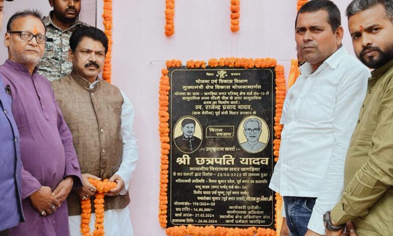 खगड़िया। योजना एवं विकास विभाग, मुख्य मंत्री क्षेत्र विकास योजनांतर्गत खगड़िया नगर परिषद क्षेत्र के वार्ड नंबर 13 में सामुदायिक भवन, चांदनी चौक के ऊपर सामुदायिक भवन का निर्माण कार्य का विधिवत उद्घाटन सदर विधायक छत्रपति यादव ने किया। योजना की प्राक्कलित राशि 14,80,000/- रुपए है।