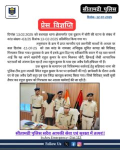दिनांक 13.02.2025 को बथनाहा थाना क्षेत्रान्तर्गत एक दुकान में चोरी की घटना के संबंध में कांड संख्या-63/25 दिनांक 13-02-2025 प्रतिवेदित किया गया था। अनुसंधान के क्रम में प्राप्त मानवीय एवं तकनीकी साक्ष्यों के आधार पर कल दिनांक -11-07-25 को उक्त कांड के नामजद अभियुक्त सुमित कापड़ को विधिवत् गिरफ्तार किया गया।