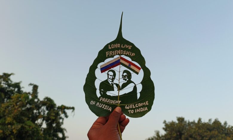 रूसी राष्ट्रपति के भारत आगमन पर लीफ आर्टिस्ट मधुरेंद्र ने पत्ता कला से तैयार कर दिया दोस्ती जिंदाबाद का संदेश