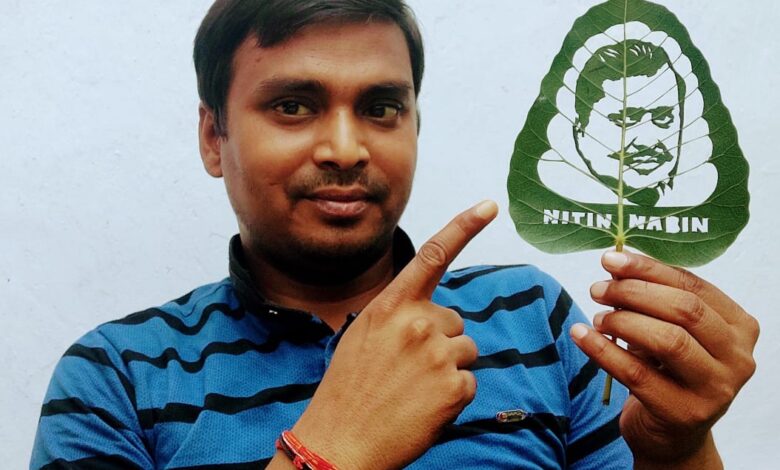 नितिन नवीन को अंतरराष्ट्रीय लीफ आर्टिस्ट मधुरेंद्र कुमार ने अनोखे अंदाज में दी बधाई